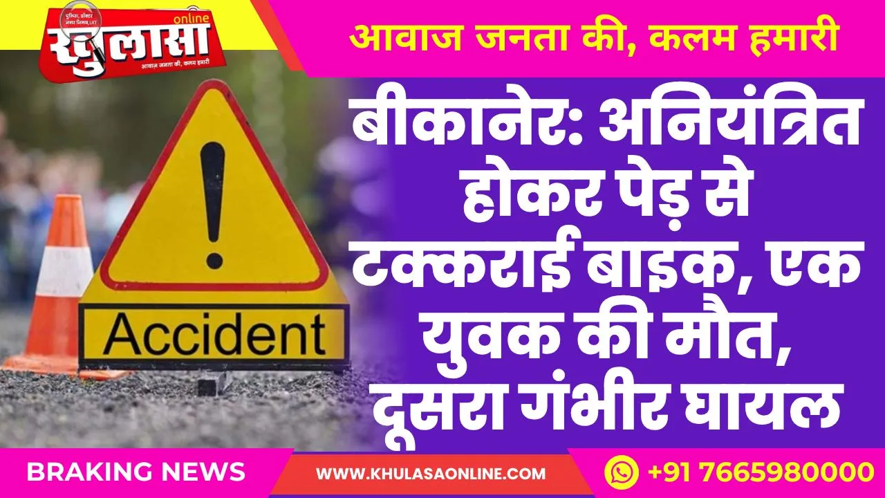 बीकानेर: अनियंत्रित होकर पेड़ से टक्कराई बाइक, एक युवक की मौत, दूसरा गंभीर घायल