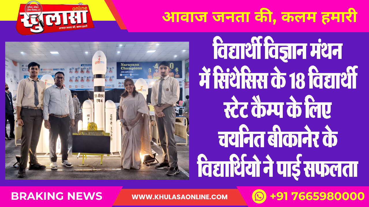 विद्यार्थी विज्ञान मंथन में सिंथेसिस के 18 विद्यार्थी स्टेट कैम्प के लिए चयनित बीकानेर के विद्यार्थियो ने पाई सफलता
