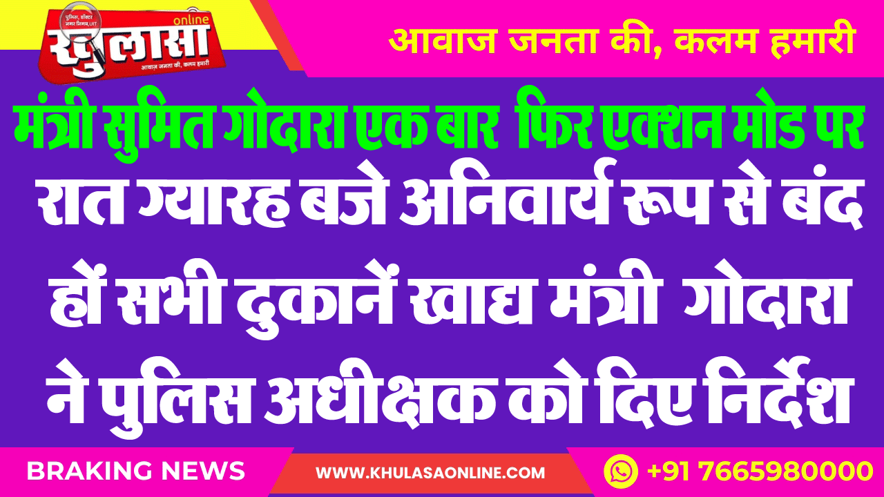 मंत्री श्री गोदारा ने बताया कि मुख्यमंत्री भजन लाल शर्मा ने प्रदेश में कानून व्यवस्था बनाए रखने तथा भ्रष्टाचार के विरुद्ध जीरो टॉलरेंस की नीति अपनाने के उद्देश्य से सभी मंत्रियों को अपने-अपने जिलों में विशेष ध्यान देने के निर्देश दिए थे। जिसकी अनुपालना में उन्होंने पूर्व में भी इसके लिए निर्देशित किया था। उन्होंने बताया कि उसके बाद समस्त दुकानें 11 बजे बंद हो जाती थी। पिछले कई दिनों से रात ग्यारह बजे के बाद भी दुकानें खुली रहती हैं। उन्होंने कहा है कि इन आदेशों की पालना में किसी स्तर पर शिथिलता नहीं हो। समस्त दुकानें अनिवार्य रूप से ग्यारह बजे तक बंद हो जाएं। जिससे किसी प्रकार की अवांछित गतिविधि की संभावना ना रहे। उन्होंने शहरी क्षेत्र के अलावा शहर के आसपास के क्षेत्र के खोखो, ढाबों और अस्थाई दुकानों के लिए विशेष ध्यान देने के लिए निर्देशित किया है।
