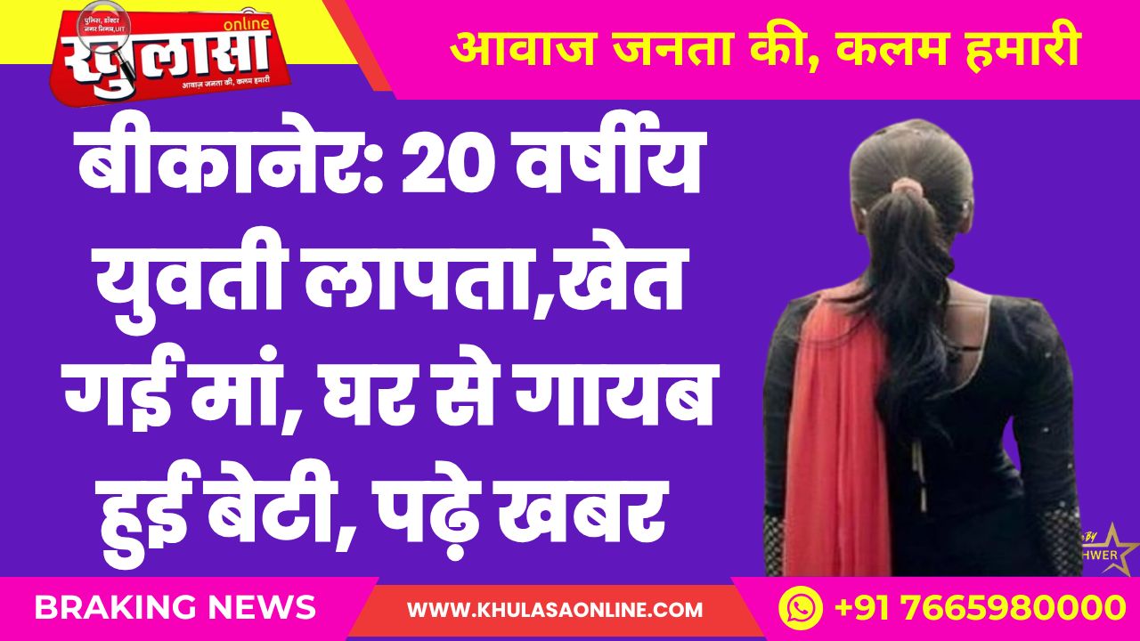 खुलासा न्यूज़, बीकानेर। जिले के श्रीडूंगरगढ़ थाना क्षेत्र से एक और युवती के लापता होने का मामला सामने आया है। मामला बिग्गाबास गांव का है, जहां एक महिला खेत पर काम करने गई और इसी दौरान उसकी 20 वर्षीय बेटी घर से अचानक गायब हो गई।