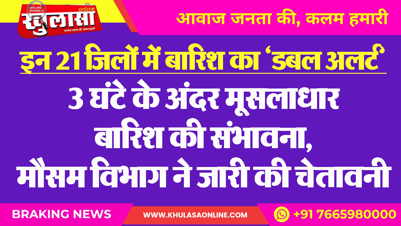 इन 21 जिलों में बारिश का ‘डबल अलर्ट’, 3 घंटे के अंदर मूसलाधार बारिश की संभावना, मौसम विभाग ने जारी की चेतावनी