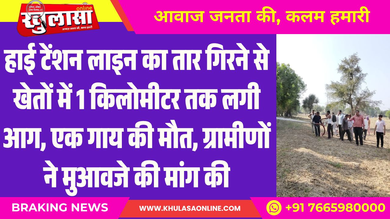 हाई टेंशन लाइन का तार गिरने से खेतों में 1 किलोमीटर तक लगी आग, एक गाय की मौत, ग्रामीणों ने मुआवजे की मांग