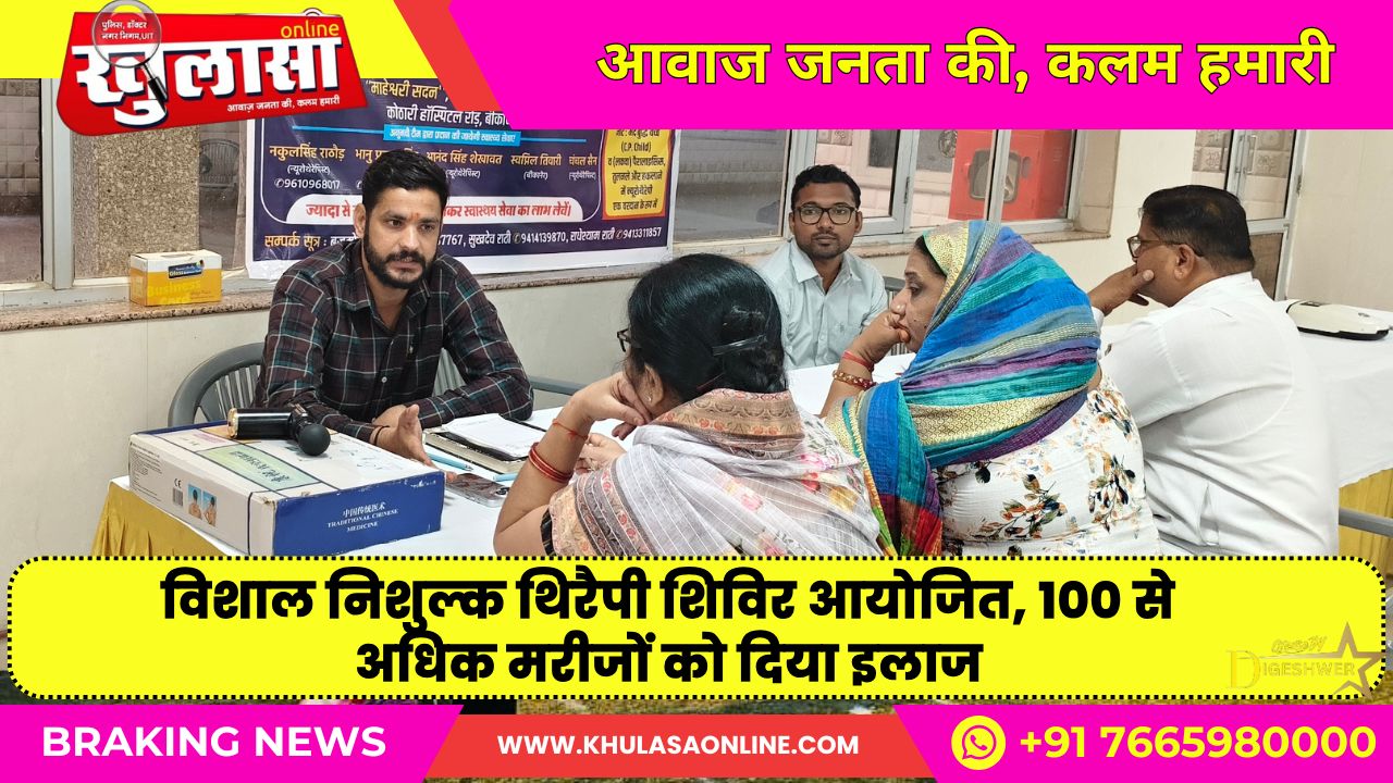 खुलासा न्यूज़, बीकानेर। माहेश्वरी सदन ट्रस्ट और डॉ लाजपत राय मेहरा न्यूरोथेरेपी स्वास्थ्य केंद्र के संयुक्त तत्वाधान में विशाल निशुल्क थिरैपी शिविर का आयोजन आज दिनांक 8 अक्टूबर बुधवार को माहेश्वरी सदन, देवी सिंह भाटी के घर के सामने कोठारी रोड़ पर आयोजित हुआ। इस दौरान न्यूरोथैरेपिस्ट नकुल सिंह राठौड़ ने बताया कि यह न्यूरोथेरेपी एक प्राकृतिक चिकित्सालय है इसमें बिना दवा, बिना साइड इफेक्ट के मरीजों को न्यूरोथेरेपी के माध्यम से इलाज दिया जाता है।