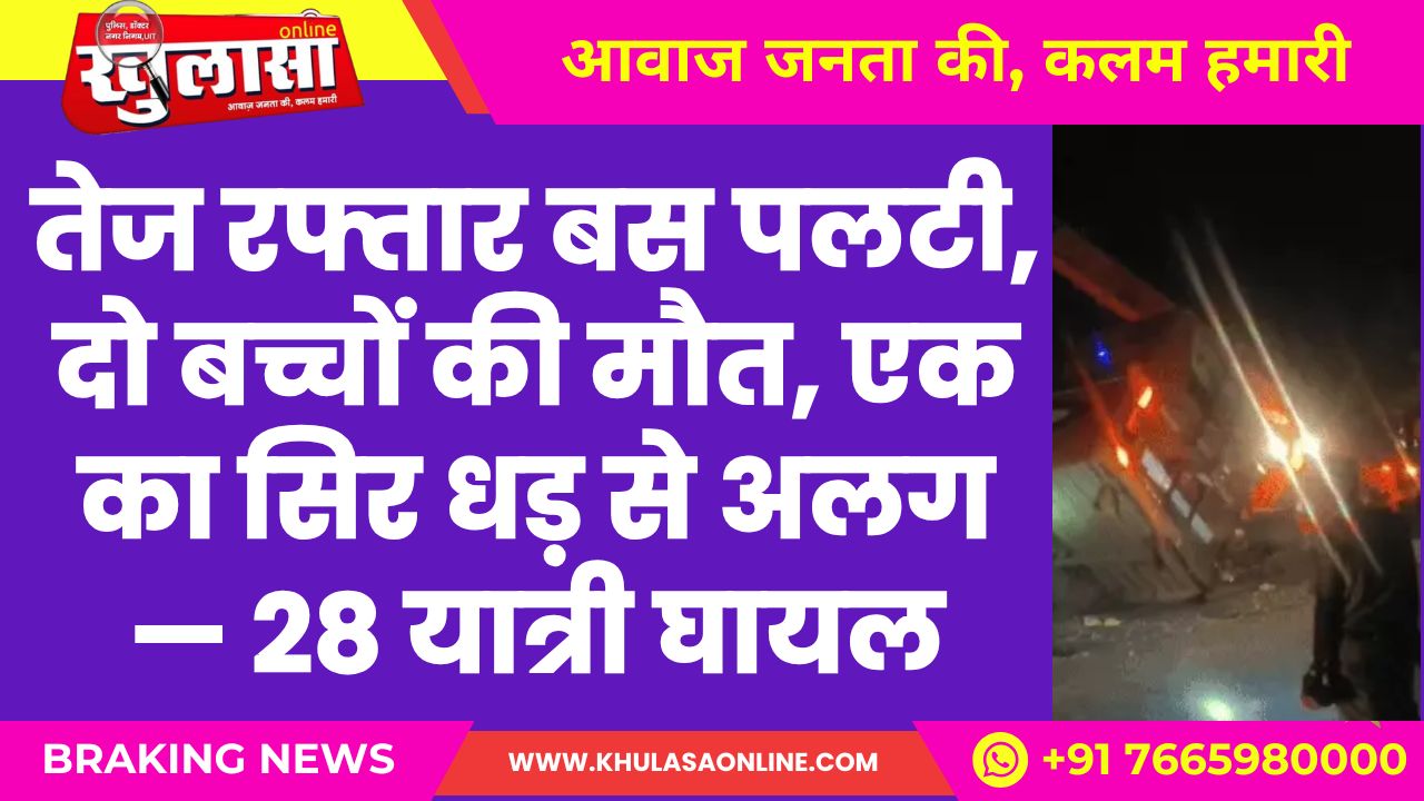 तेज रफ्तार बस पलटी, दो बच्चों की मौत, एक का सिर धड़ से अलग — 28 यात्री घायल