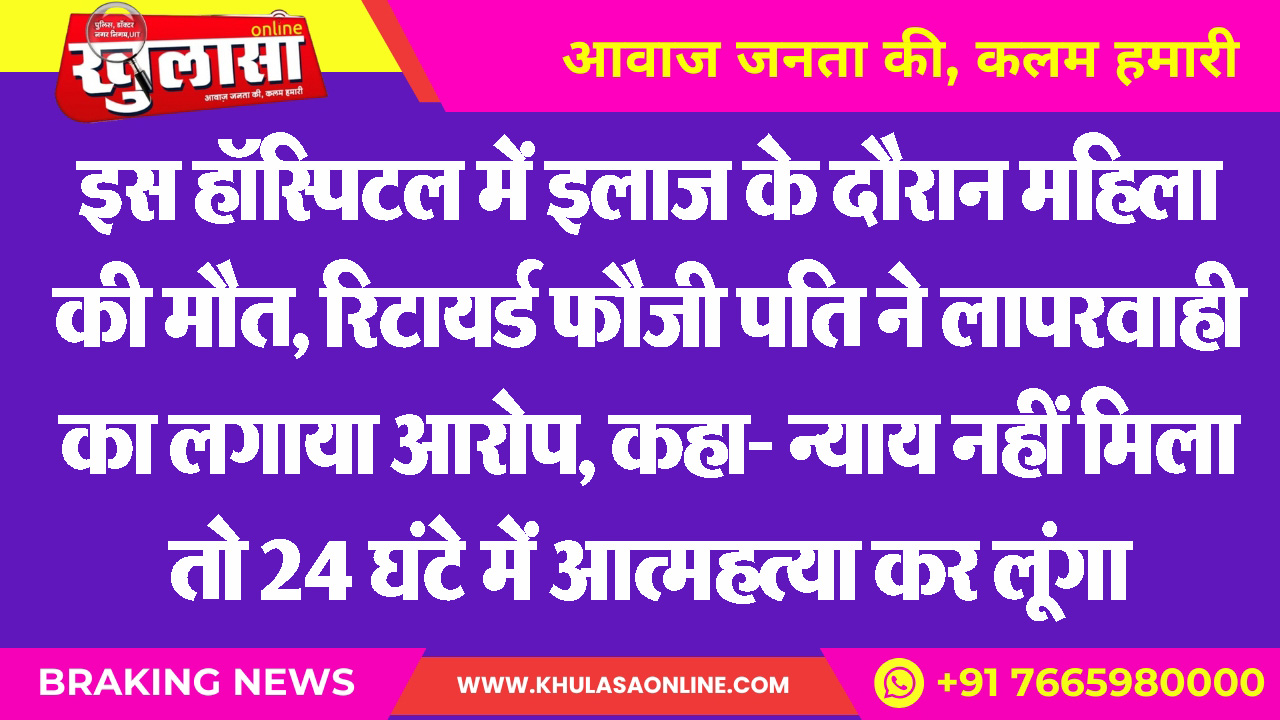 इस हॉस्पिटल में इलाज के दौरान महिला की मौत, रिटायर्ड फौजी पति ने लापरवाही का लगाया आरोप, कहा- न्याय नहीं मिला तो 24 घंटे में आत्महत्या कर लूंगा