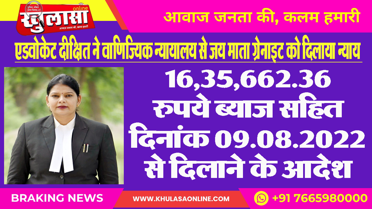 एडवोकेट दीक्षित ने वाणिज्यिक न्यायालय से जय माता ग्रेनाइट को दिलाया न्याय – 16,35,662.36 रुपये ब्याज सहित दिनांक 09.08.2022 से दिलाने के आदेश