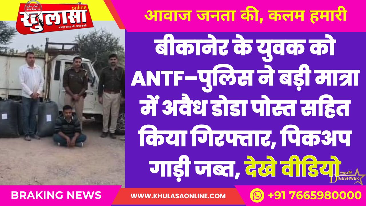 बीकानेर के युवक को ANTF–पुलिस ने बड़ी मात्रा में अवैध डोडा पोस्त सहित किया गिरफ्तार, पिकअप गाड़ी जब्त, देखे वीडियो