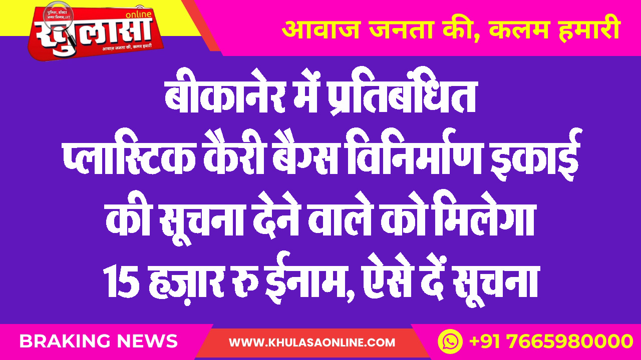 बीकानेर में प्रतिबंधित प्लास्टिक कैरी बैग्स विनिर्माण इकाई की सूचना देने वाले को मिलेगा 15 हज़ार रु ईनाम, ऐसे दें सूचना