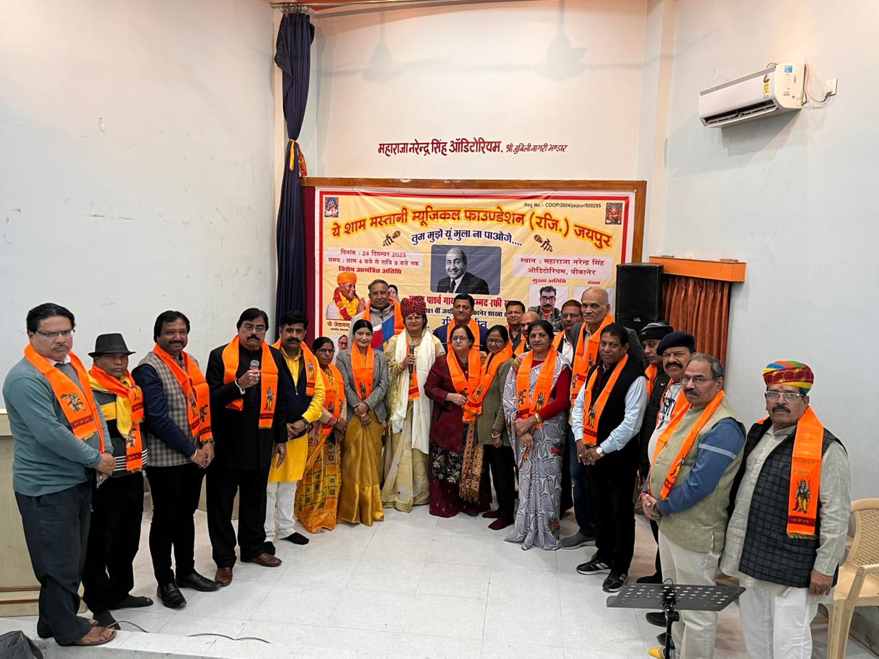 बीकानेर। मोहम्मद रफी की 101 वीं जयंती पर ये शाम मस्तानी म्यूजिकल फाउण्डेशन रजि.जयपुर की बीकानेर शाखा द्वारा बुधवार बीकानेर के स्थानीय महाराजा नरेंद्र सिंह ऑडोटोरियम हॉल में आयोजित कार्यक्रम “तुम मुझे यूं भुला नहीं पाओगे” स्वाराजंलि गीत संगीत में बीजेपी शहर अध्यक्ष सुमन छाजेड़ ने कार्यक्रम आयोजक सुनील दत्त नागल, स्थानीय गायक कलाकार राजेन्द्र बोथरा, रवि भल्ला, नंदकिशोर भूंड, इंजीनियर राजेश सांखला, राजेन्द्र पडिहार, राहुल रंगा राजस्थानी , दीपक पारीक, केशव पारीक सहित अन्य कलाकारों के साथ रफी के गीतों की शानदार प्रस्तुतियां देकर कार्यक्रम में समां बांधा दिया। इस अवसर पर अतिथियों के तौर पर मंच पर मौजूद रहे अनिल राठौड़ संयुक्त निदेशक पर्यटन विभाग, पूर्व पार्षद सुनील बांठिया, समाज सेवी सुशील यादव, पूर्व पार्षद डॉ मीना आसोपा, समाज सेवी एनडी कादरी,किसन जोशी, कार्यक्रम सहयोगी सैय्यद अख्तर, के.कुमार आहूजा , जितेन्द्र व्यास, शाकिर हुसैन चौपदार, देवेश भाटी,रोमी राज , राधिका खत्री, पूर्व पार्षद झमकू देवी, श्रीमती रेशमा वर्मा, राधाकृष्णन सोनी, मनोज व्यास , गोपाल गोत्तम( महाराज), छगन लाल, मेहबूब अली तेली, मोइनुद्दीन कोहरी सहित अन्य संगीत प्रेमियों ने मोहम्मद रफी के तेल चित्र पर पुष्प अर्पित कर