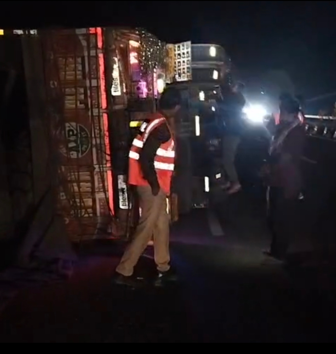 भारतमाला सड़क पर पलटा गेहूं से भरा ट्रक,एक घायल