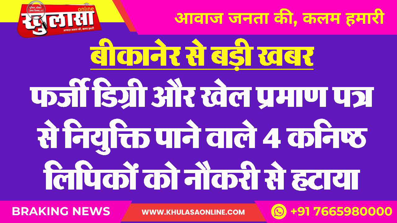 बीकानेर से बड़ी खबर : फर्जी डिग्री और खेल प्रमाण पत्र से नियुक्ति पाने वाले 4 कनिष्ठ लिपिकों को नौकरी से हटाया