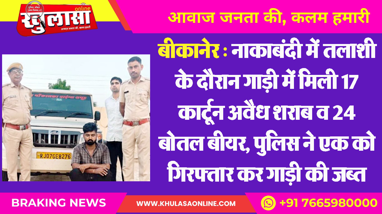 बीकानेर : नाकाबंदी में तलाशी के दौरान गाड़ी में मिली 17 कार्टून अवैध शराब व 24 बोतल बीयर, पुलिस ने एक को गिरफ्तार कर गाड़ी की जब्त