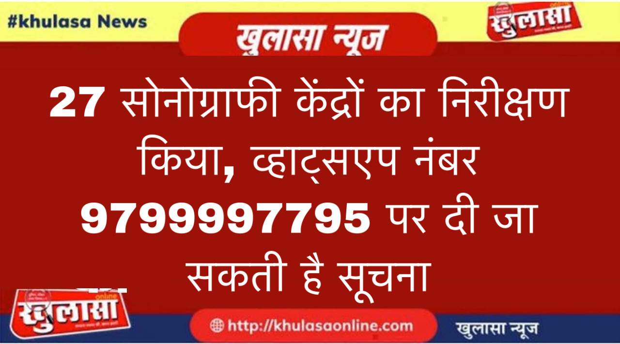 बीकानेर/ 27 सोनोग्राफी केंद्रों का निरीक्षण किया, व्हाट्सएप नंबर 9799997795 पर दी जा सकती है सूचना