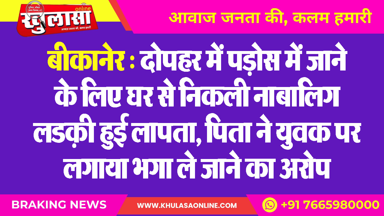 बीकानेर : दोपहर में पड़ोस में जाने के लिए घर से निकली नाबालिग लडक़ी हुई लापता, पिता ने युवक पर लगाया भगा ले जाने का अरोप