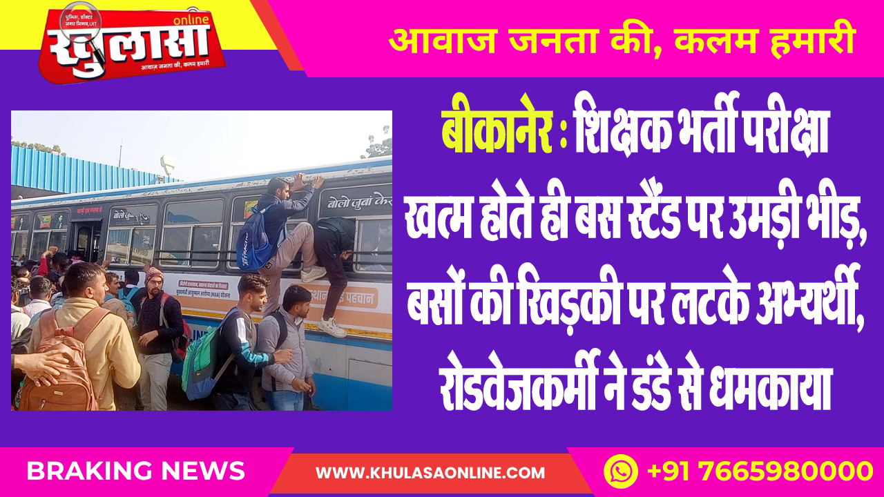 बीकानेर : शिक्षक भर्ती परीक्षा खत्म होते ही बस स्टैंड पर उमड़ी भीड़, बसों की खिडक़ी पर लटके अभ्यर्थी, रोडवेजकर्मी ने डंडे से धमकाया