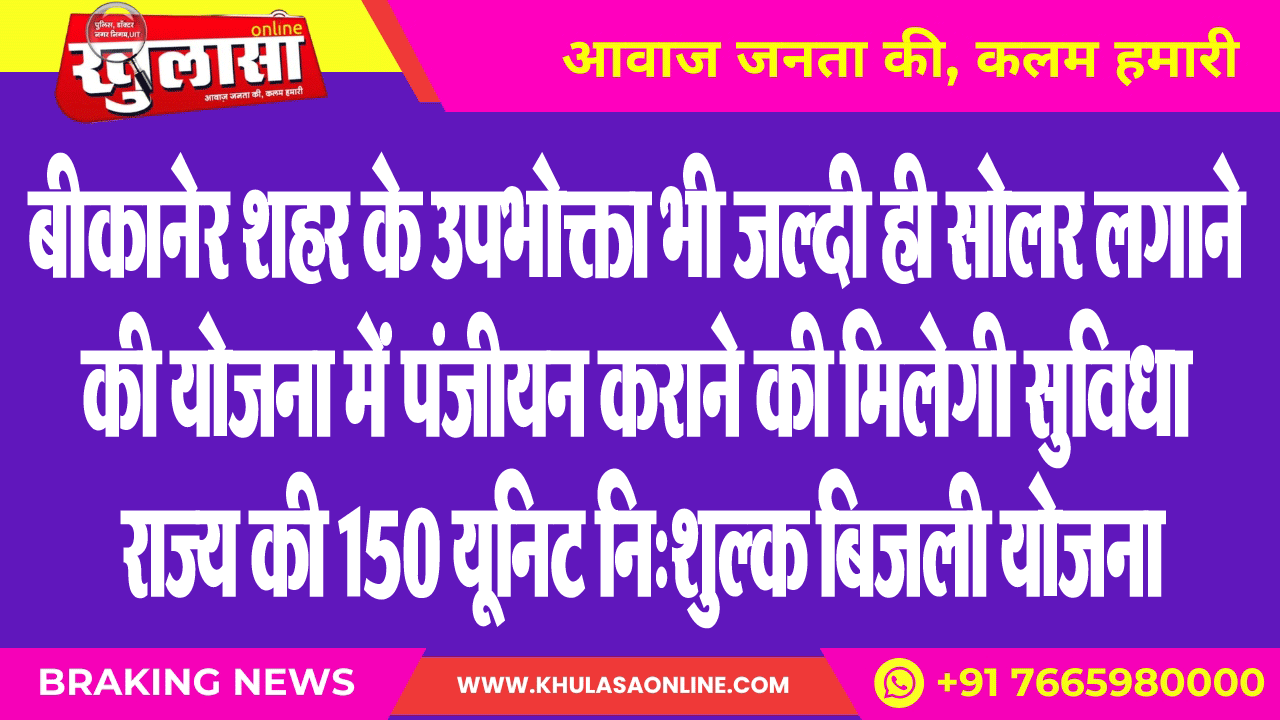 बीकानेर शहर के उपभोक्ता भी जल्दी ही सोलर लगाने की योजना में पंजीयन कराने की मिलेगी सुविधा राज्य की 150 यूनिट नि:शुल्क बिजली योजना