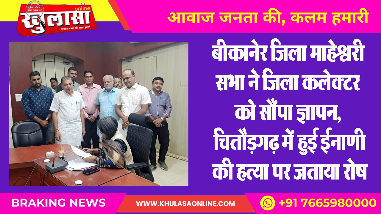 बीकानेर जिला माहेश्वरी सभा ने जिला कलेक्टर को सौंपा ज्ञापन, चितौडग़ढ़ में हुई ईनाणी की हत्या पर जताया रोष
