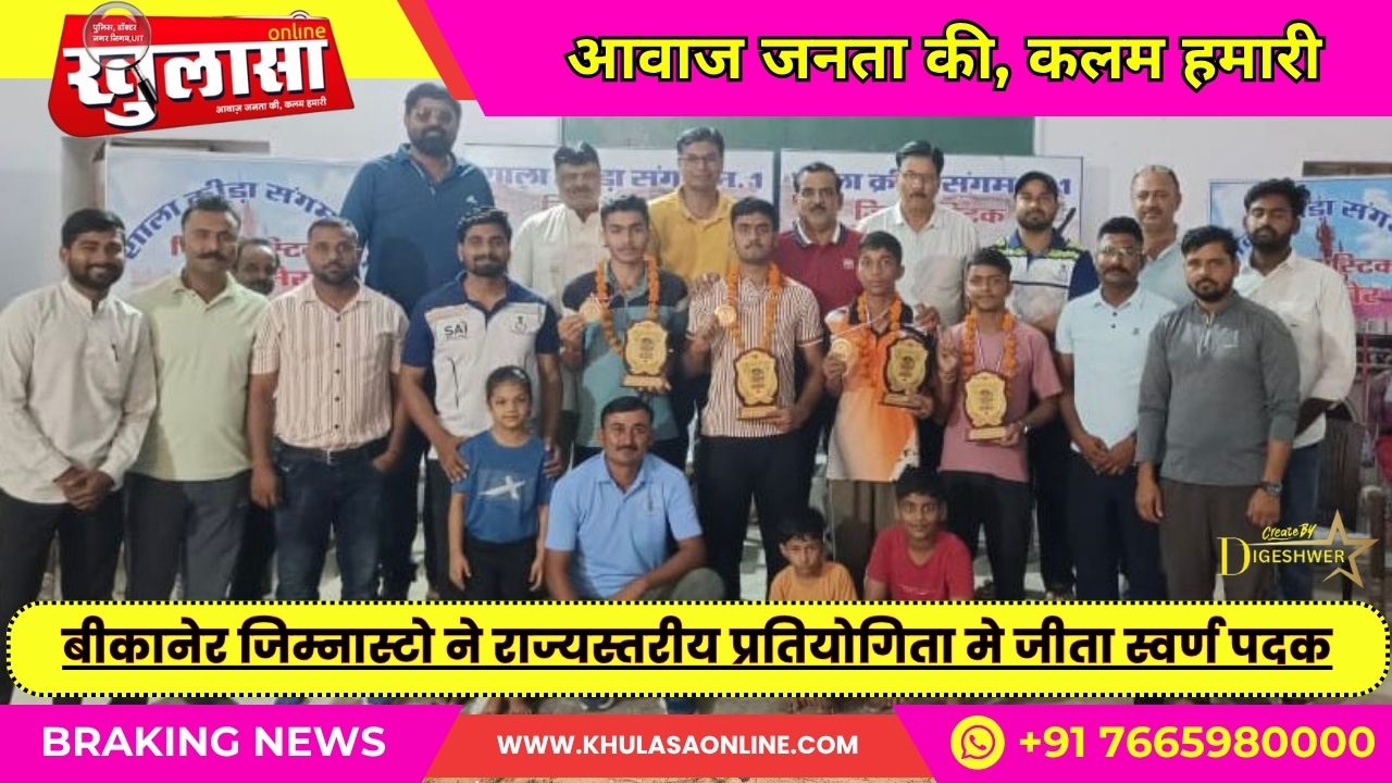 खुलासा न्यूज़। बीकानेर शाला क्रीड़ा संगम नंबर 01 के जिम्नास्टो ने सरूपगंज सिरोही मे आयोजित 69 वीं राज्यस्तरीय प्रतियोगिता 17 व 19 वर्ष छात्र /छात्रा मे एक्रोबेटीक ग्रुप जिम्नास्टिक मे स्वर्ण पदक जीतकर टीम ने प्रथम स्थान प्राप्त किया जिसमें अरविन्द सिंह भाटी, कृष्णराज सिंह भाटी, मयंक दैया व आनन्द सिंह यह 4 खिलाडी थे इन चारों ने जिम्नास्टिक मे बीकानेर जिले का नाम रोशन किया