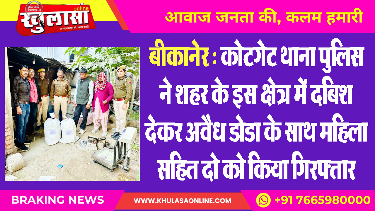 बीकानेर : कोटगेट थाना पुलिस ने शहर के इस क्षेत्र में दबिश देकर अवैध डोडा के साथ महिला सहित दो को किया गिरफ्तार