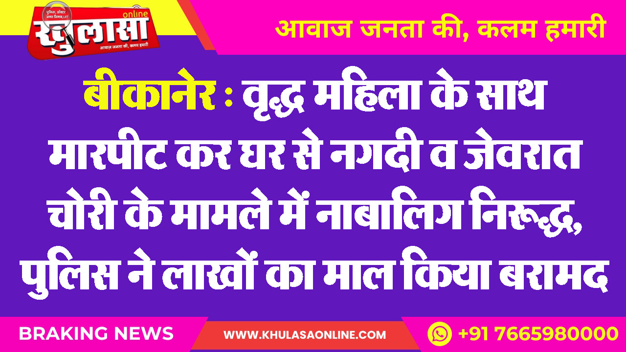 बीकानेर : वृद्ध महिला के साथ मारपीट कर घर से नगदी व जेवरात चोरी के मामले में नाबालिग निरूद्ध, पुलिस ने लाखों का माल किया बरामद