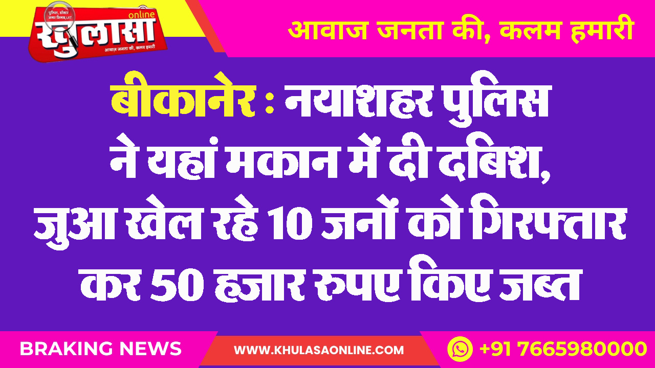 बीकानेर : नयाशहर पुलिस ने यहां मकान में दी दबिश, जुआ खेल रहे 10 जनों को गिरफ्तार कर 50 हजार रुपए किए जब्त