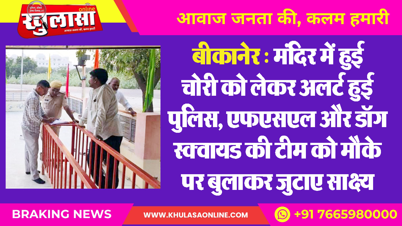 बीकानेर : मंदिर में हुई चोरी को लेकर अलर्ट हुई पुलिस, एफएसएल और डॉग स्क्वायड की टीम को मौके पर बुलाकर जुटाए साक्ष्य