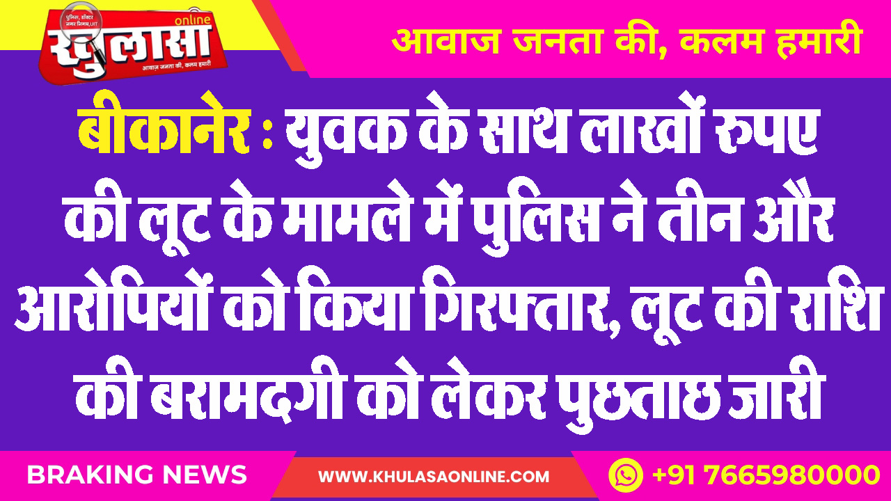 बीकानेर : युवक के साथ लाखों रुपए की लूट के मामले में पुलिस ने तीन और आरोपियों को किया गिरफ्तार, लूट की राशि की बरामदगी को लेकर पुछताछ जारी