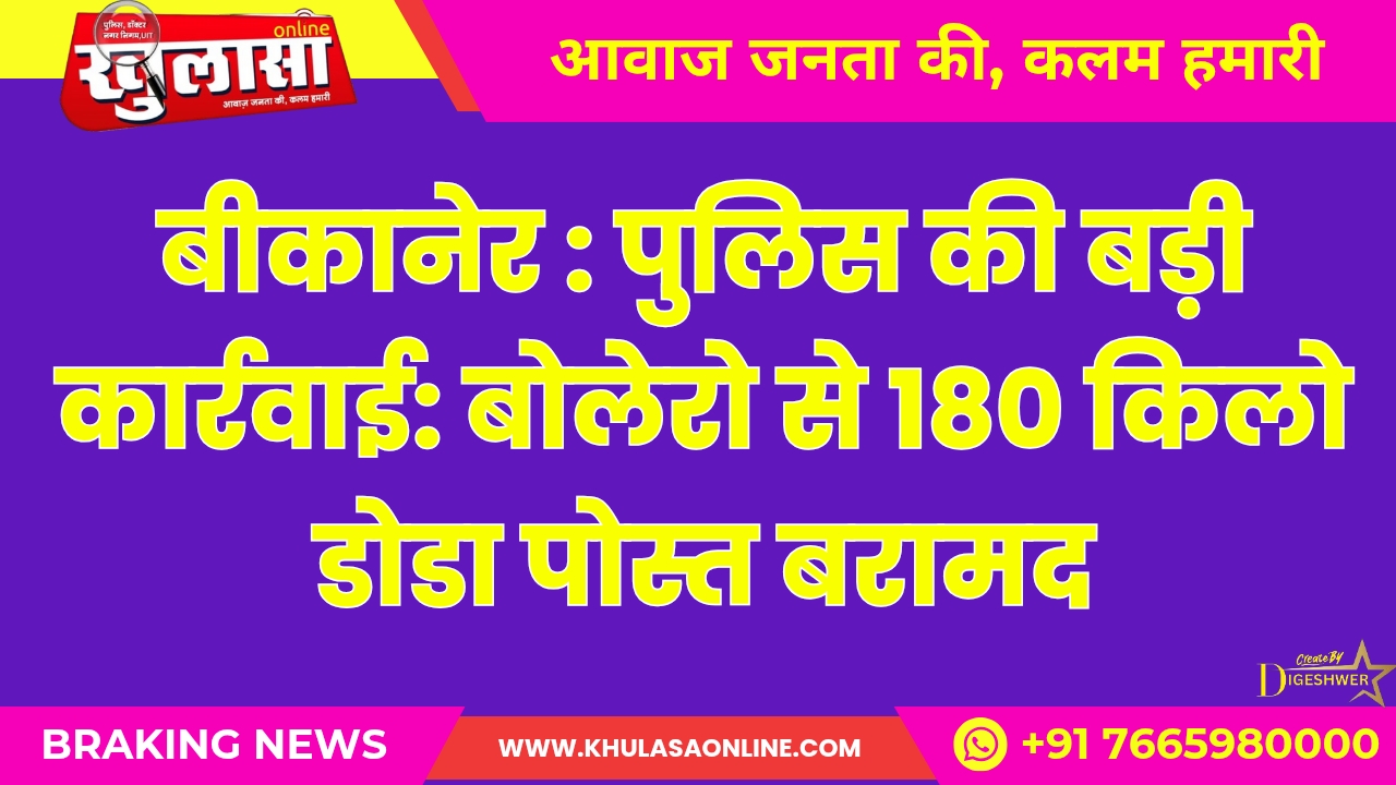बीकानेर : पुलिस की बड़ी कार्रवाई: बोलेरो से 180 किलो डोडा पोस्त बरामद