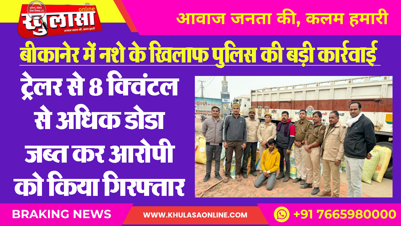 बीकानेर में नशे के खिलाफ पुलिस की बड़ी कार्रवाई : ट्रेलर से 8 क्विंटल से अधिक डोडा जब्त कर आरोपी को किया गिरफ्तार
