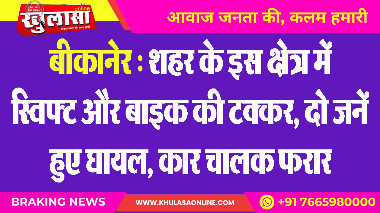 बीकानेर : शहर के इस क्षेत्र में स्विफ्ट और बाइक की टक्कर, दो जनें हुए घायल, कार चालक फरार