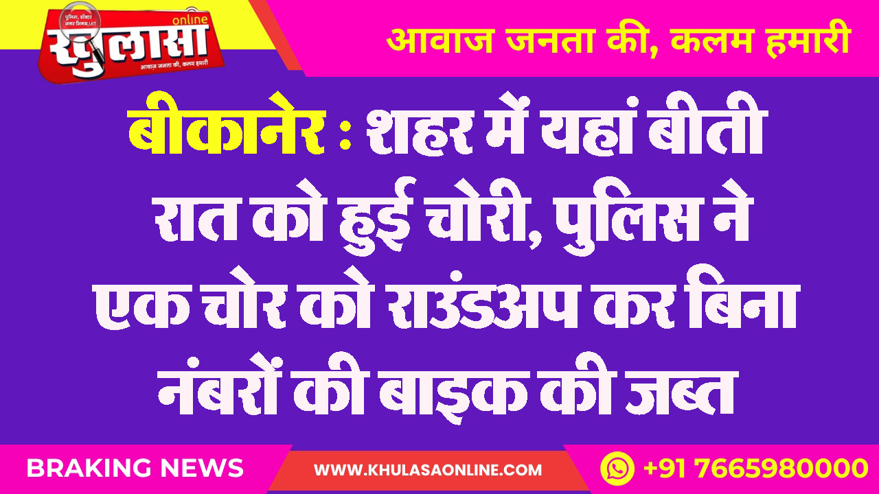 बीकानेर : शहर में यहां बीती रात को हुई चोरी, पुलिस ने एक चोर को राउंडअप कर बिना नंबरों की बाइक की जब्त