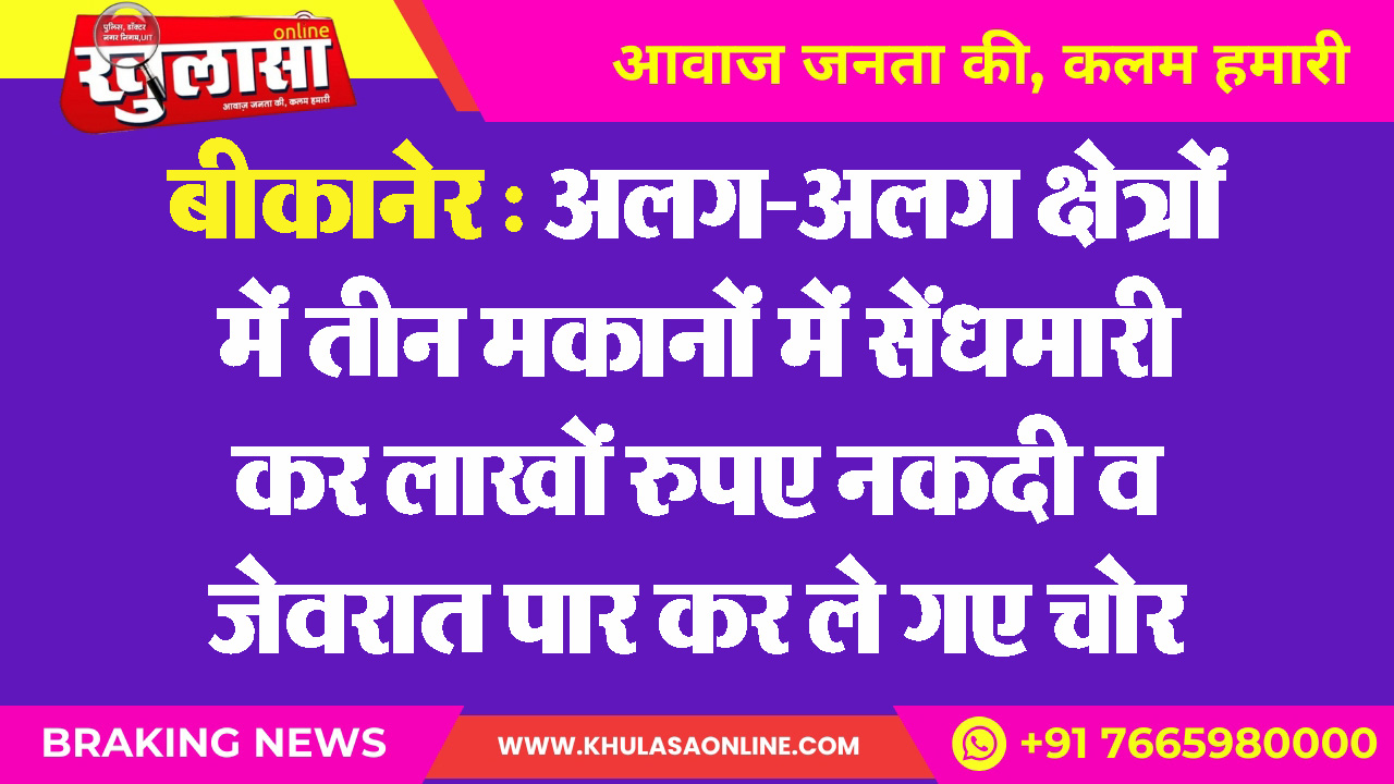 बीकानेर : अलग-अलग क्षेत्रों में तीन मकानों में सेंधमारी कर लाखों रुपए नकदी व जेवरात पार कर ले गए चोर
