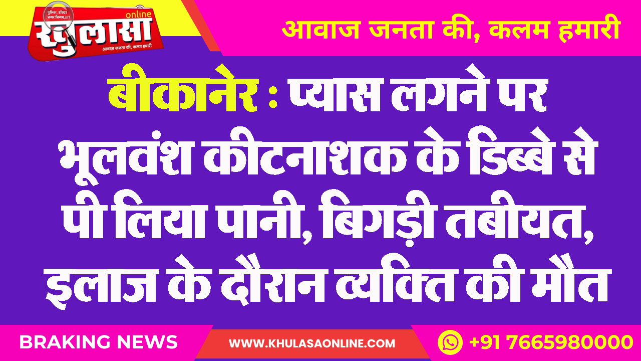 बीकानेर : प्यास लगने पर भूलवंश कीटनाशक के डिब्बे से पी लिया पानी, बिगड़ी तबीयत, इलाज के दौरान व्यक्ति की मौत
