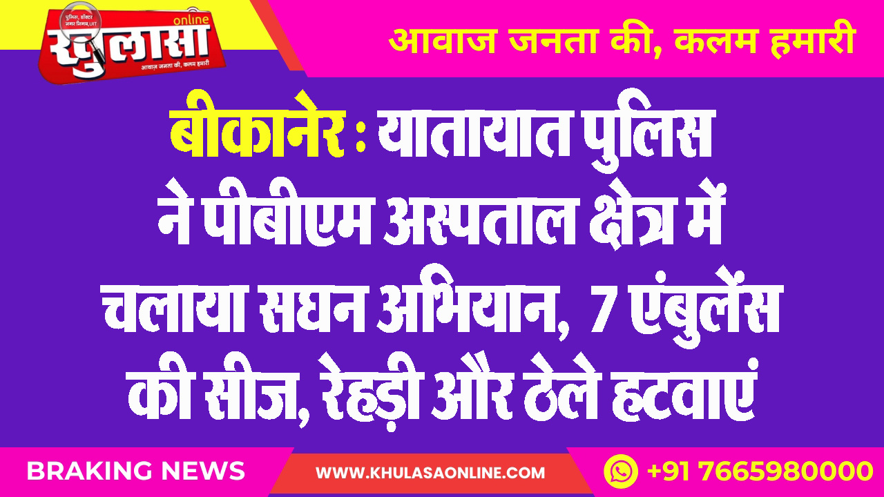 बीकानेर : यातायात पुलिस ने पीबीएम अस्पताल क्षेत्र में चलाया सघन अभियान, 7 एंबुलेंस की सीज, रेहड़ी और ठेले हटवाएं