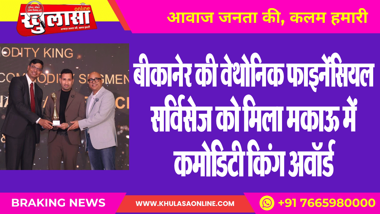 बीकानेर। बीकानेर की वेथोनिक फ़ाइनेंशियल सर्विस को हाल ही में मकाऊ में आयोजित एंजेल वन इलीट समिट 2025 में च्कमोडिटी किंगज् अवार्ड से सम्मानित किया गया। यह पुरस्कार कंपनी को उसके बेहतर प्रदर्शन और ग्राहकों के प्रति जिम्मेदार कामकाज के लिए दिया गया।