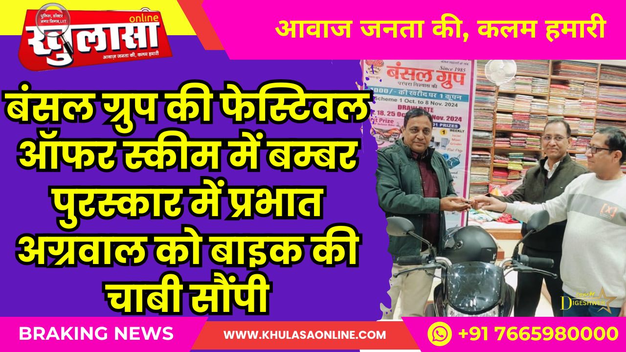 बंसल ग्रुप की फेस्टिवल ऑफर स्कीम में बम्बर पुरस्कार में प्रभात अग्रवाल को बाइक की चाबी सौंपी