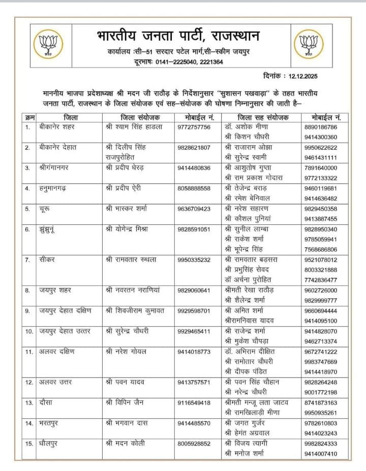 बीकानेर। भाजपा प्रदेशाध्यक्ष मदन राठौड़ के निर्देशानुसार ‘सुशासन पखवाड़ा’ के तहत भारतीय जनता पार्टी, राजस्थान के जिला संयोजक एवं सह-संयोजक की घोषणा की गई है। शहर भाजपा बीकानेर में श्याम सिंह हाड़ला को जिला संयोजक तथा डॉ. अशोक मीणा व किशन चौधरी को जिला सह संयोजक बनाया गया है। इसी तरह देहात भाजपा बीकानेर में दिलीप सिंह राजपुरोहित को जिला संयोजक तथा राजाराम ओझा व सुरेन्द्र स्वामी को जिला सह संयोजक नियुक्त किया गया है।
