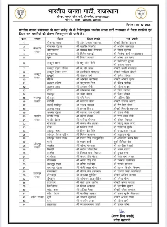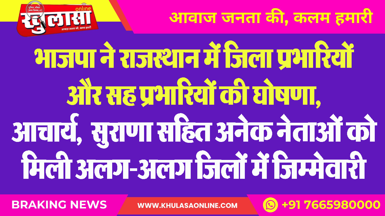 भाजपा ने राजस्थान में जिला प्रभारियों और सह प्रभारियों की घोषणा, आचार्य, सुराणा सहित अनेक नेताओं को मिली अलग-अलग जिलों में जिम्मेवारी