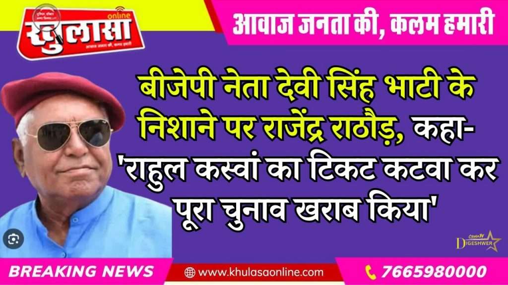 बीजेपी नेता देवी सिंह भाटी के निशाने पर राजेंद्र राठौड़, कहा- ‘राहुल कस्वां का टिकट कटवा कर पूरा चुनाव खराब किया खुलासा न्यूज़। लोकसभा चुनाव 2024 में राजस्थान में बीजेपी को 11 सीटों का बड़ा नुकसान हुआ है. वहीं अब चुनाव समाप्त होने के बाद राजस्थान में हारे 11 सीटों पर कारणों का पता लगाया जा … Continue reading बीजेपी नेता देवी सिंह भाटी के निशाने पर राजेंद्र राठौड़, कहा- ‘राहुल कस्वां का टिकट कटवा कर पूरा चुनाव खराब किया’