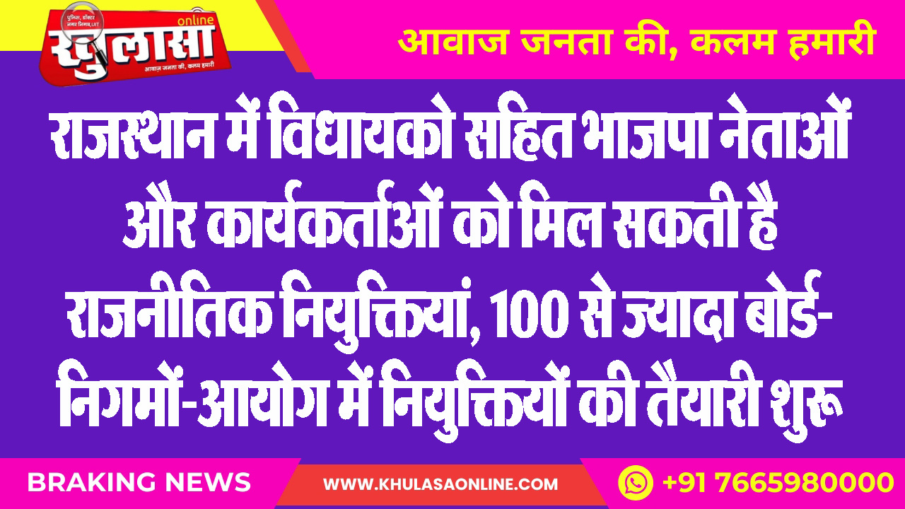 राजस्थान में विधायको सहित भाजपा नेताओं और कार्यकर्ताओं को मिल सकती है राजनीतिक नियुक्तियां, 100 से ज्यादा बोर्ड-निगमों-आयोग में नियुक्तियों की तैयारी शुरू