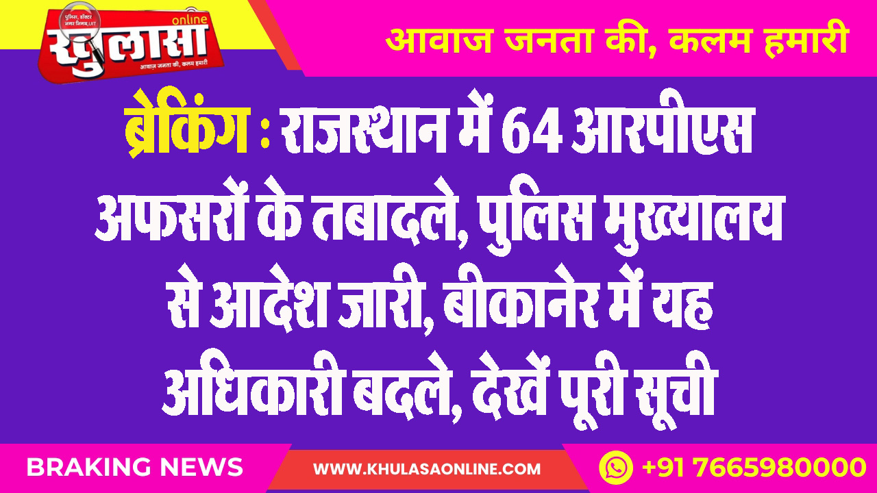 ब्रेकिंग : राजस्थान में 64 आरपीएस अफसरों के तबादले, पुलिस मुख्यालय से आदेश जारी, बीकानेर में यह अधिकारी बदले, देखें पूरी सूची