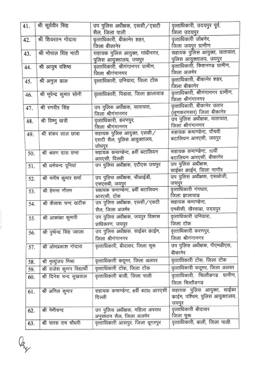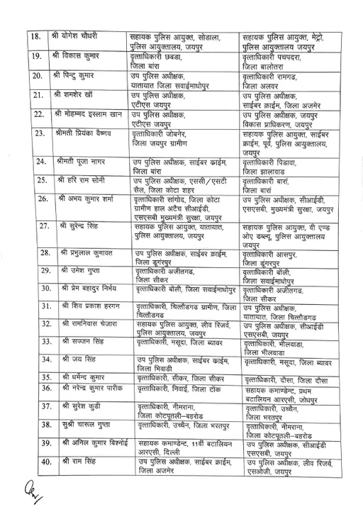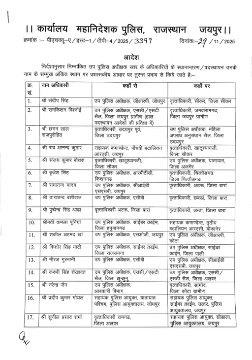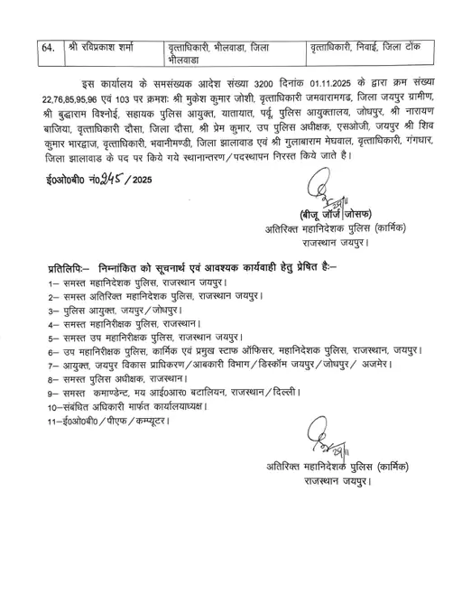 6 अफसरों के आदेश किए निरस्त मुकेश कुमार जोशी को वृत्ताधिकारी जमवारामगढ़ (जयपुर ग्रामीण), बुद्धाराम विश्नोई को एसीपी ट्रैफिक पूर्व जयपुर कमिश्नरेट जोधपुर, नारायण बाजिया को वृत्ताधिकारी दौसा, प्रेम कुमार को उपाधीक्षक, एसओजी जयपुर, शिव कुमार भारद्वाज को वृत्ताधिकारी भवानीमंडी (झालावाड़) और गुलाबराम मेघवाल को वृत्ताधिकारी गंगधार (झालावाड़) के ट्रांसफर को निरस्त किया गया है। 1 नवंबर को इनका तबादला किया गया था।