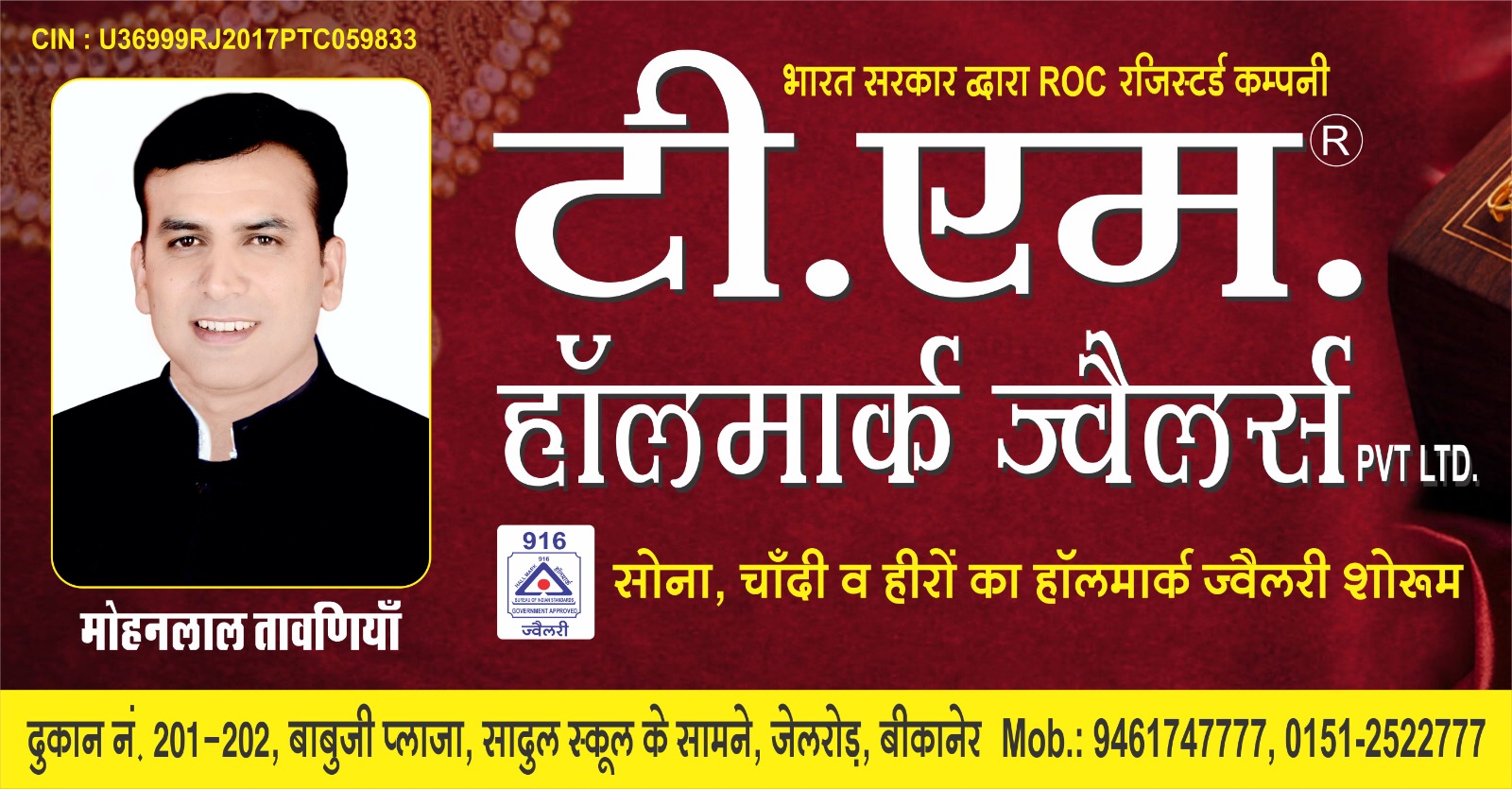 टी.एन.ज्वैलर्स हॉलमार्क ज्वैलरी शोरूम बाबूजी प्लाजा मो 800355555 जेवराती सोना 20 कैरट 109200 रेट , 22 कैरट 114200 चांदी 150200 |