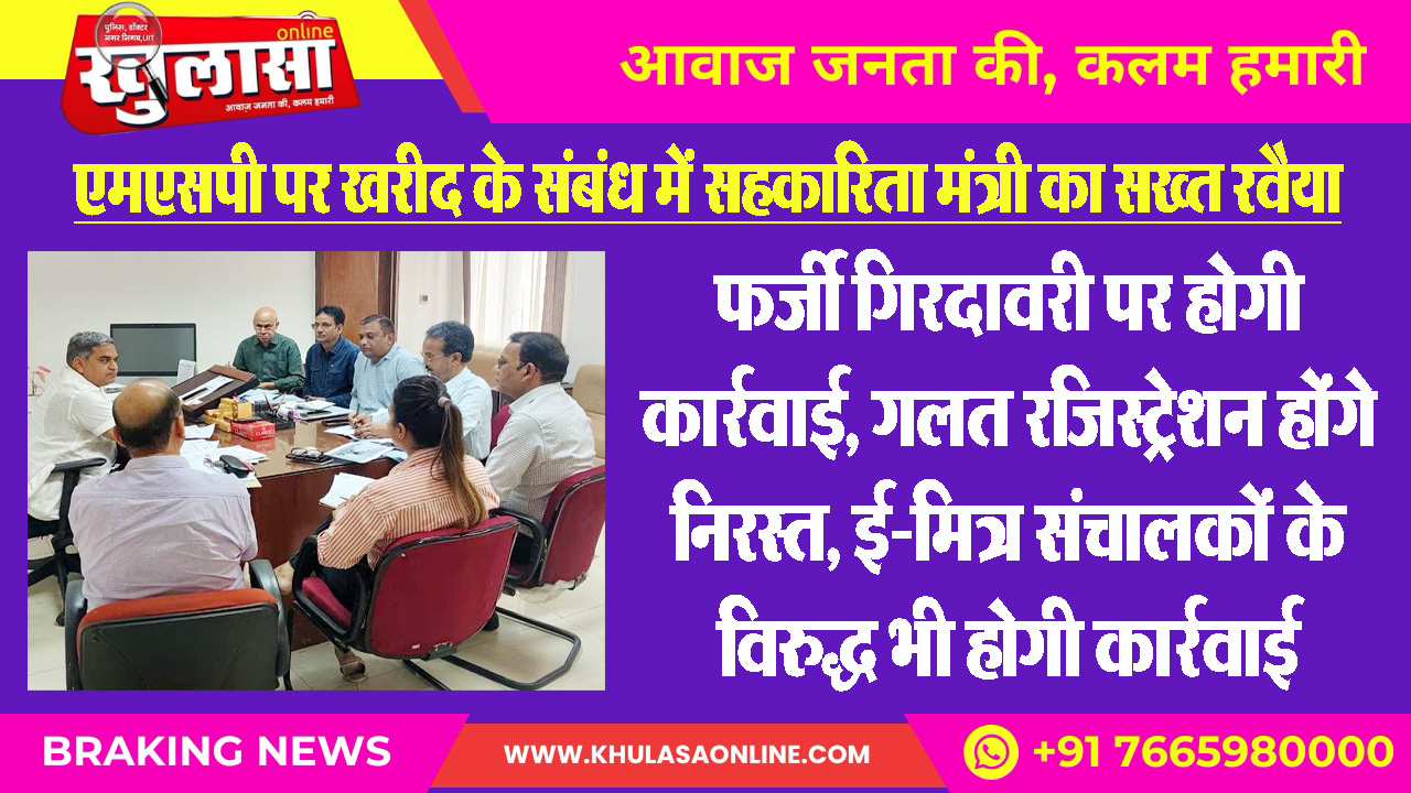 एमएसपी पर खरीद के संबंध में सहकारिता मंत्री का सख्त रवैया : फर्जी गिरदावरी पर होगी कार्रवाई, गलत रजिस्ट्रेशन होंगे निरस्त, ई-मित्र संचालकों के विरुद्ध भी होगी कार्रवाई