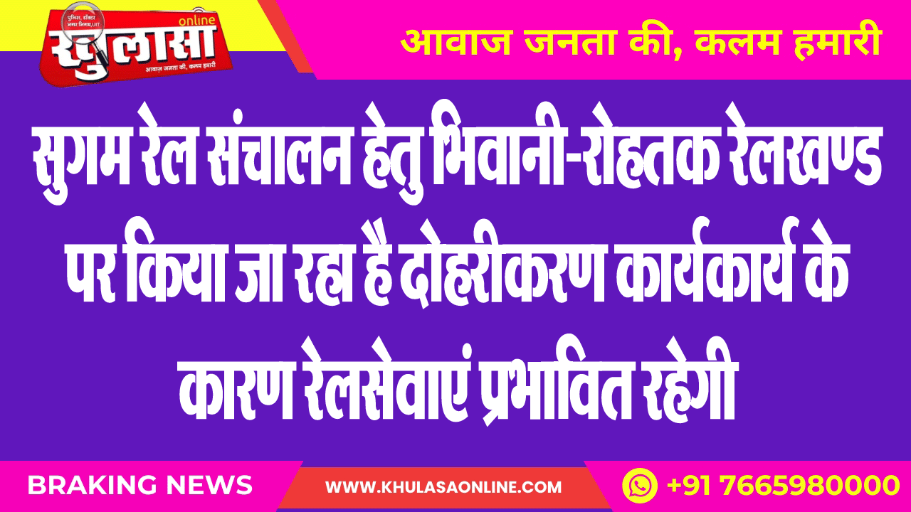 सुगम रेल संचालन हेतु भिवानी-रोहतक रेलखण्ड पर किया जा रहा है दोहरीकरण कार्यकार्य के कारण रेलसेवाएं प्रभावित रहेगी
