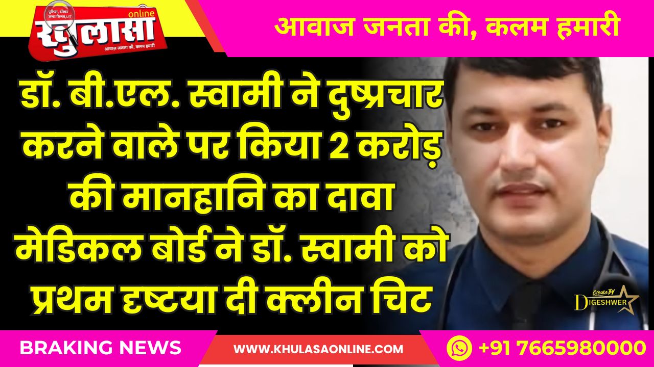 डॉ. बी.एल. स्वामी ने दुष्प्रचार करने वाले पर किया 2 करोड़ की मानहानि का दावा मेडिकल बोर्ड ने डॉ. स्वामी को प्रथम दृष्टया दी क्लीन चिट