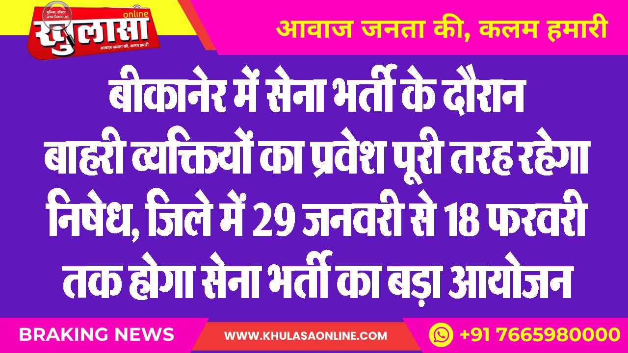बीकानेर में सेना भर्ती के दौरान बाहरी व्यक्तियों का प्रवेश पूरी तरह रहेगा निषेध, जिले में 29 जनवरी से 18 फरवरी तक होगा सेना भर्ती का बड़ा आयोजन