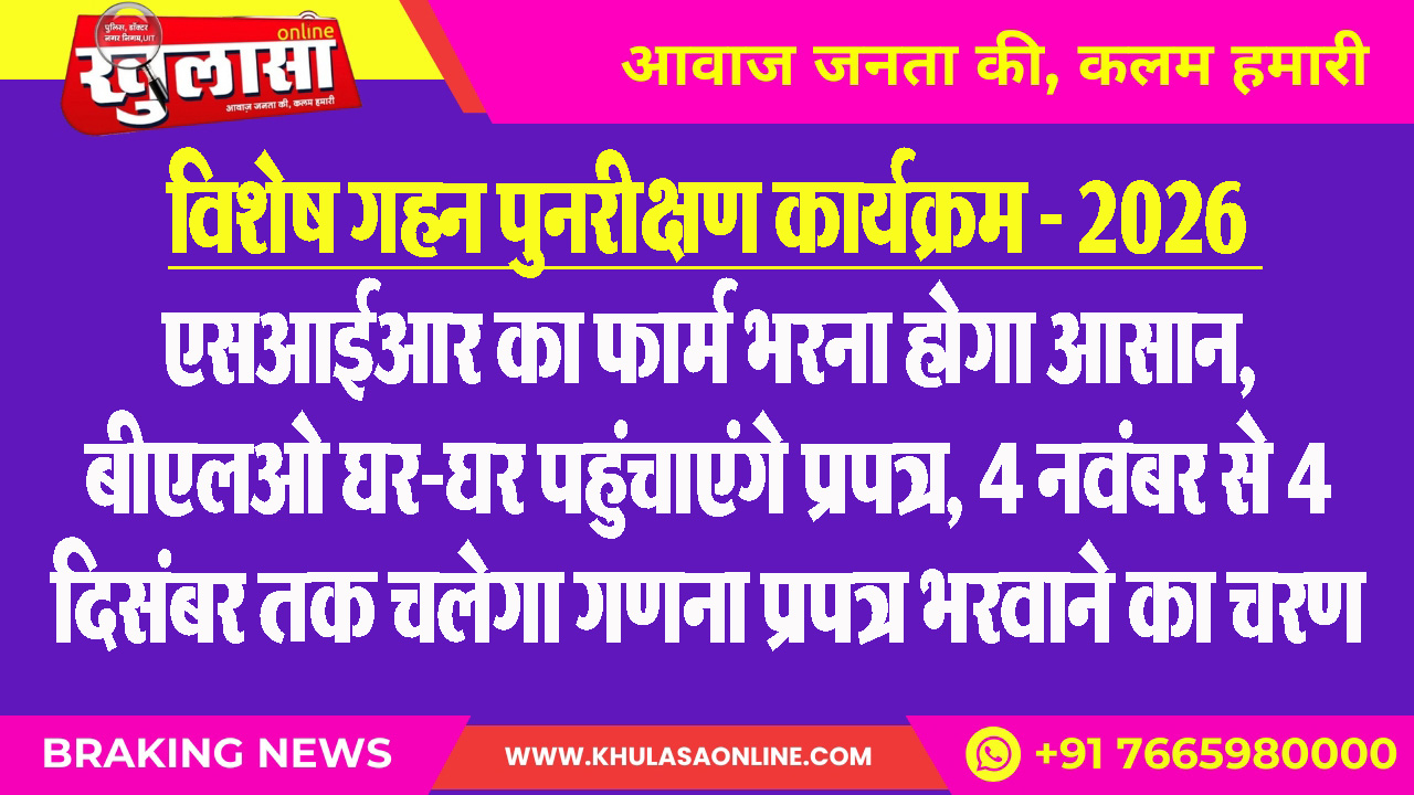विशेष गहन पुनरीक्षण कार्यक्रम – 2026 : एसआईआर का फार्म भरना होगा आसान, बीएलओ घर-घर पहुंचाएंगे प्रपत्र, 4 नवंबर से 4 दिसंबर तक चलेगा गणना प्रपत्र भरवाने का चरण