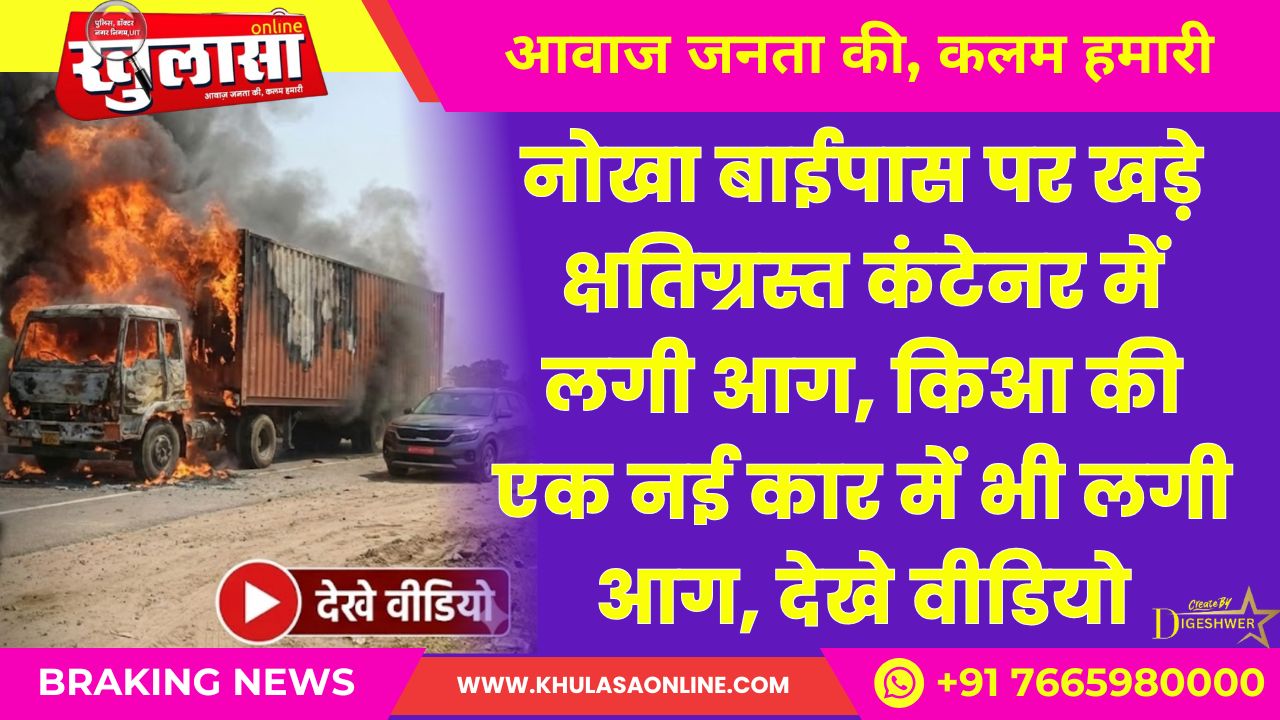 नोखा बाईपास पर खड़े क्षतिग्रस्त कंटेनर में लगी आग, किआ की एक नई कार में भी लगी आग, देखे वीडियो