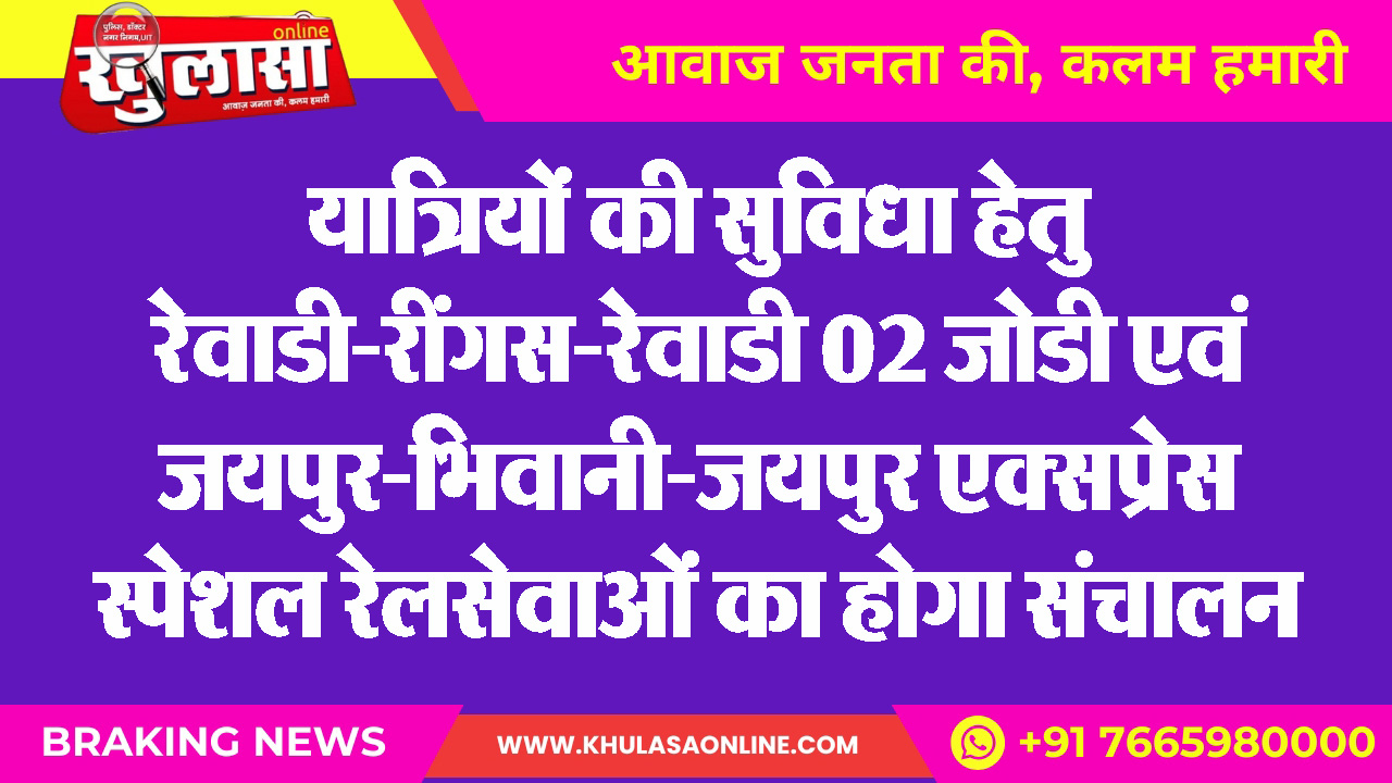 यात्रियों की सुविधा हेतु रेवाडी-रींगस-रेवाडी 02 जोडी एवं जयपुर-भिवानी-जयपुर एक्सप्रेस स्पेशल रेलसेवाओं का होगा संचालन